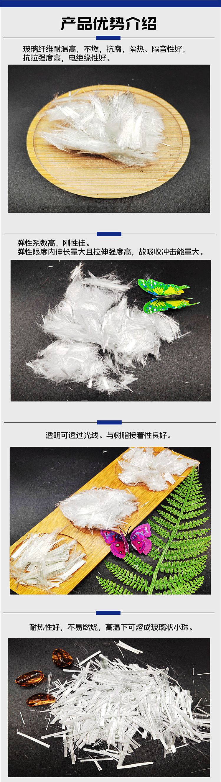 原料及其应用:玻璃纤维比有机纤维耐温高,不燃,抗腐,隔热、隔音性好,抗拉强度高,电绝缘性好。用来制造增强塑料或增强橡胶,作为补强材玻璃纤维具有以下特点: