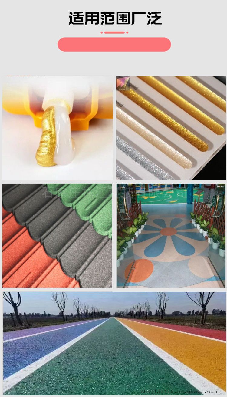 轻质砂密度低、吸油量低填充粘度低,用于美缝剂中增加产品色彩与外观美感,聚脲树脂中使用量35-45%填充不发脆保持柔韧性,可降低树脂收缩率增加耐温性能、表面硬度与耐污耐磨系数。轻质砂可用于环氧与聚脲美缝剂中,添加可增加耐磨、耐候、防腐、防水、耐污染、耐黄变、粘结力、防霉性、防挥发性、增韧、耐高温、挤出性等,使用树脂砂增加表面美观性对色泽、光泽度、粘度影响低。 美缝剂彩砂是美缝剂行业的一种无毒、无味、无害、无放射性、颜色可以定制的新型材料。